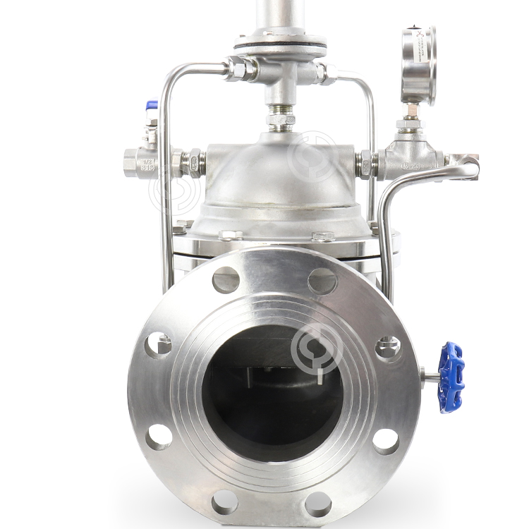1.作为泄压阀:将泄压/持压导阀调节为泄压状态时,水通过针形阀,主阀控制室,球阀a,泄压/持压导阀和球阀b以及此时主阀处于打开状态,当入口压力超过泄压/持压导阀设立的安全值时,泄压先导阀将自动打开,部分水将通过球阀c获释以获释管道压力。当压力回复到安全值时,泄压阀自动关闭。当做泄压阀时,每个球阀均处于常开状态。