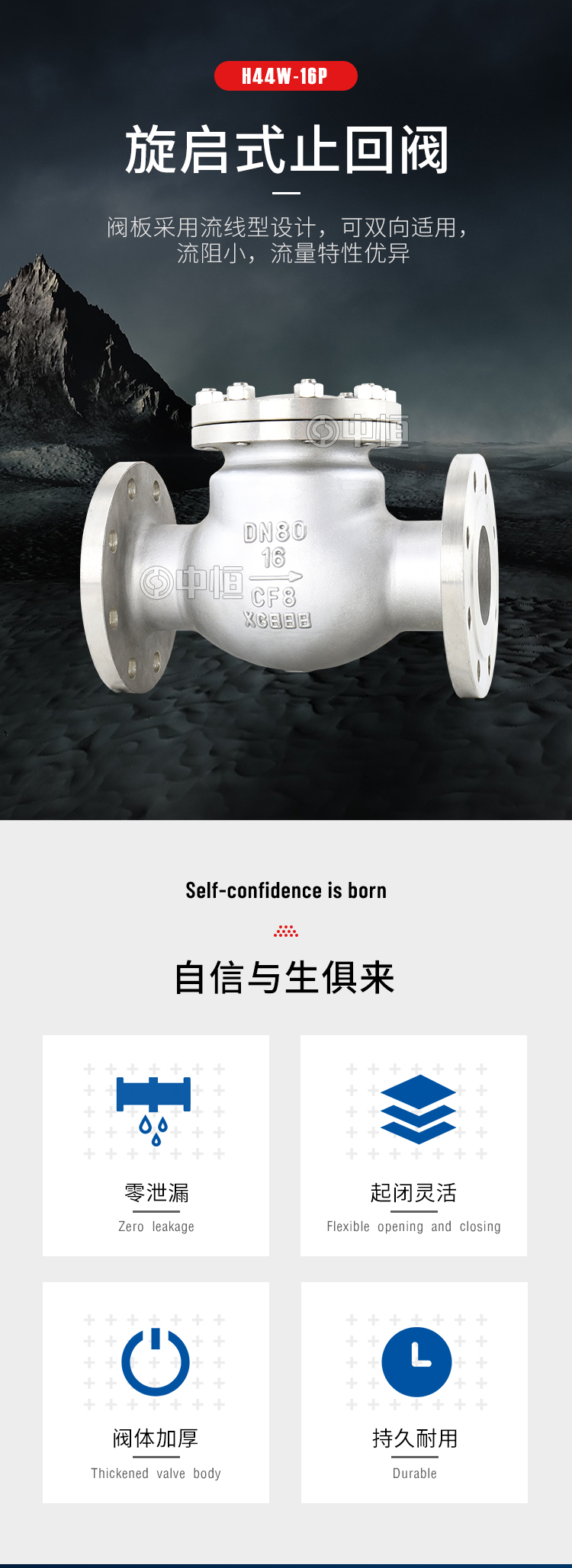 旋启式止回阀适用于公称压力PN1.6Mpa〜42.0mpa,Class150〜2500lb;公称通径DN15〜500mm,PNS1/2〜20“;工作温度:-196〜540℃,以防止介质倒流。阀体材质包括碳钢,不锈钢等,可用于水,蒸气,气体,油,酸性介质等