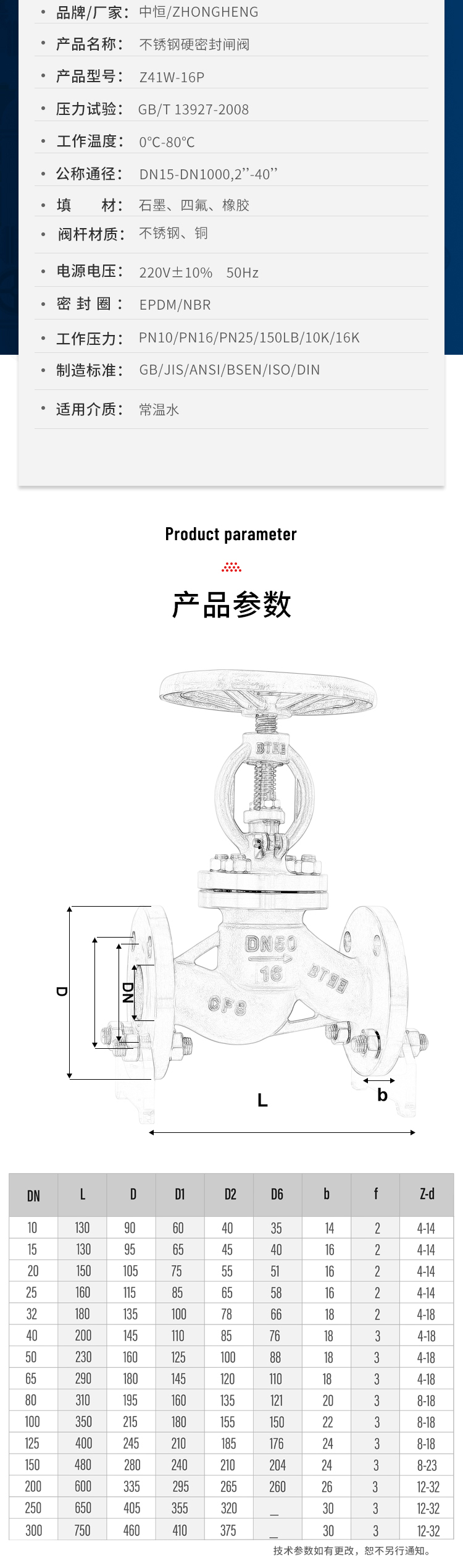 Z41H,Z41Y,Z41W不锈钢闸阀主要性能参数