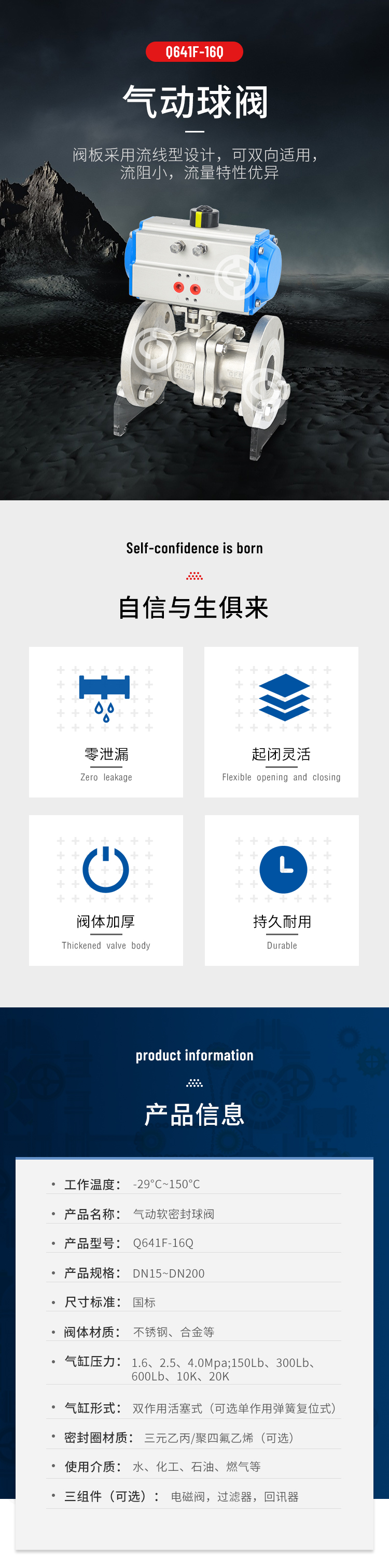 产品详情:气动法兰球阀Q641F-16Q由双功用或单功用气动活塞式执行器和浮动球阀构成。执行器还可以装备路程限制开关,电磁阀,减压阀和0.4-0.7mpa的气源来实现开关台臣valves气动不锈钢球阀由压缩空气提供动力,阀杆带动阀芯在阀体内旋转90°,以实现阀门的切换。全然开启和全然关闭的动作。气动执行器相联,外观美丽,拆装迅速,操作灵巧,性能优良,匹配简便,流通量大。手轮部门的底面与阀门连通,支架面与连接与气缸一同,阀轴与蜗轮的内孔相匹配,阀轴端的四个侧面与气缸的方孔相匹配。(工作过程:在气动时,气缸驱动阀蜗杆和蜗轮同时旋转。在手动操作中,蜗杆和蜗轮齿合驱动阀轴旋转,气缸活塞旋转。)旋转手柄以关闭蜗杆时,会出现顶齿现象,您需将手轮转至一定视角将其关闭,当将操作手柄旋入做到时,需拧紧限位橡胶螺母,拧开限位橡胶螺母后,手柄处于关闭位置,请手动操作,此时不能气动:关闭手柄,将蜗轮和蜗杆脱开以实现气动。松开限位橡胶螺母,手柄处于关闭位置,气动开关手动松开限位橡胶螺母,手柄处于关闭状况位置时,可能会出现顶齿,并且需前后旋转手柄,以保证正确啮合蜗轮和蜗轮。